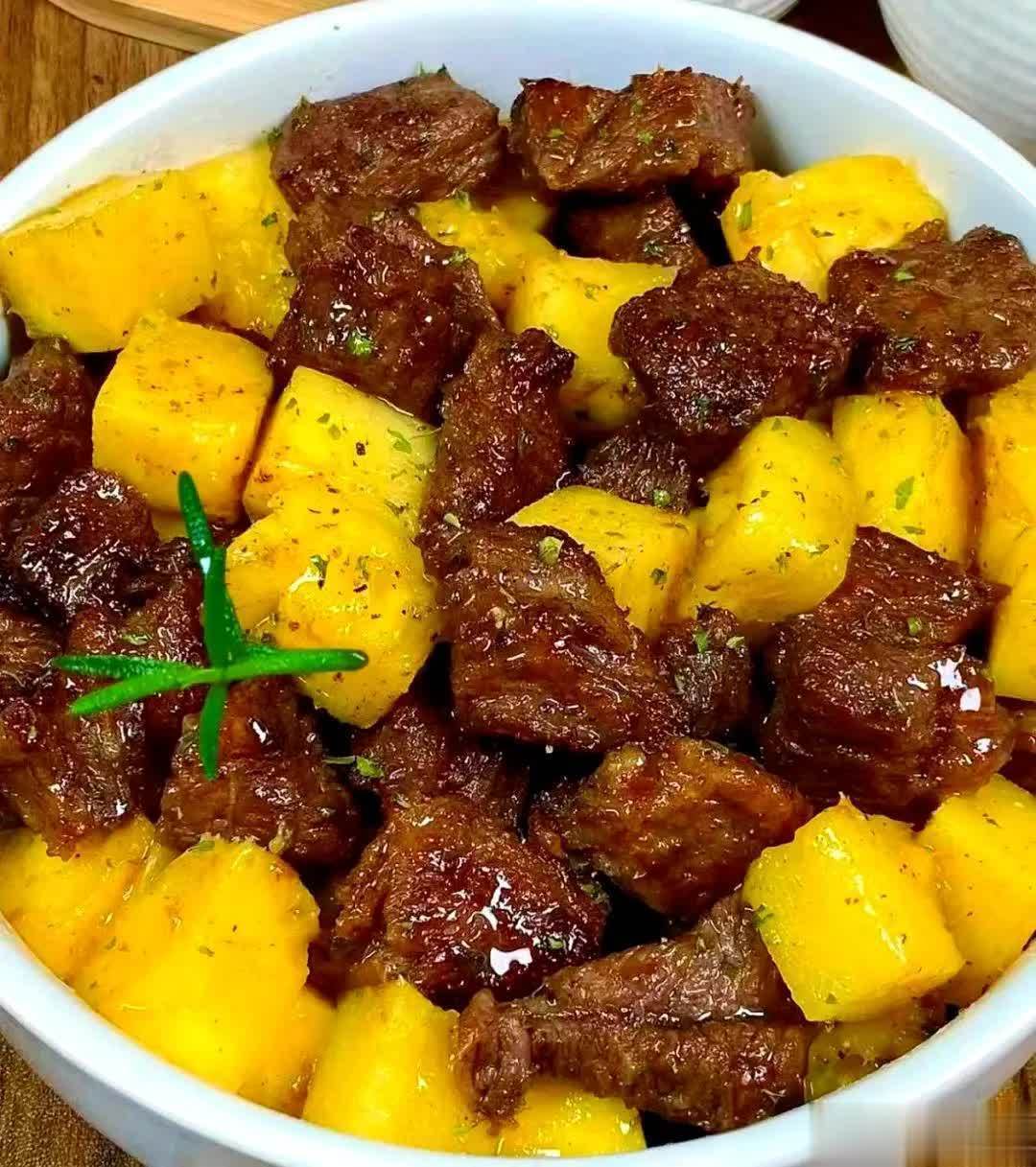 6. 翻炒10秒就关火,保留菠萝的酸甜和牛肉的鲜嫩,酸甜开胃,减脂期也能吃得很满足。