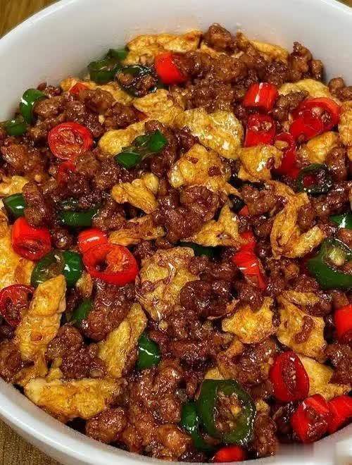 5.将肉末和鸡蛋倒回锅中,接着加入1勺生抽,再加入1勺蚝油,接下来放入少许盐以及鸡精,之后进行翻炒,使其均匀,仅需5分钟就能完成,这道菜香辣可口,超级下饭!
