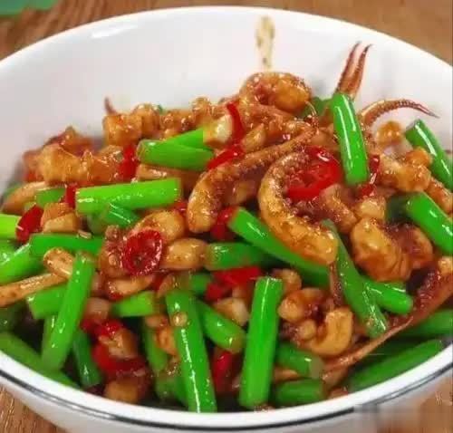 6. 加入焯好的鱿鱼圈,淋入生抽和蚝油调味。